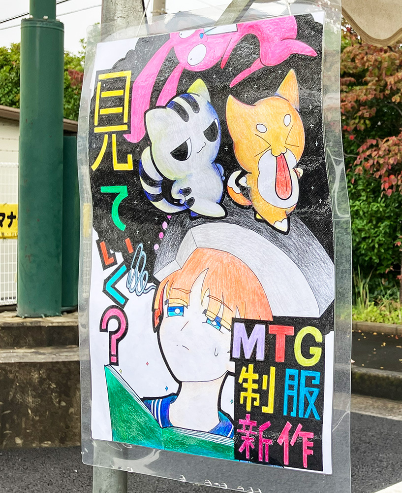それと言いますのも、「元郷中学校」様は創立80周年にむけて制服のリニューアルを企画されています。そのお知らせを兼ねて、“予告”の形で、展示をさせて頂いたのです。